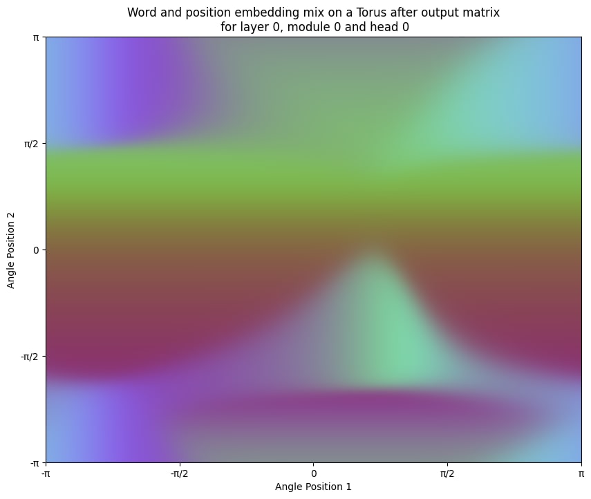 Using this approach, we can represent a Transformer with an inner dimension of 3, any number of heads or tokens, using only 2D plots. In this context, plots on a torus imply that opposite sides of the square image are connected.