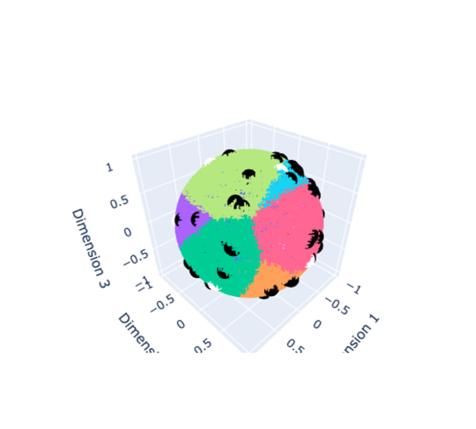 However, when composing this map with the unembedding to get the Transformer’s clustering, we observe that neither edges nor colors easily correlate with the way the clustering is done. This is partly because we don’t have a method to color the 3D space in a manner that is both linear (where adding two maps gives the map of their addition) and semantically meaningful.