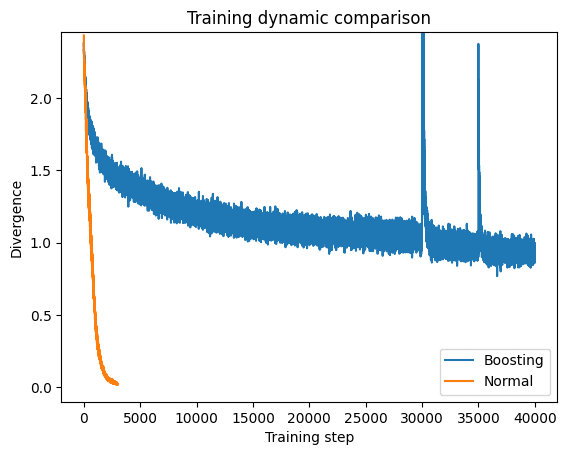Now on the second experiment, we train an AoT with the same number of heads as before, but heads are trained one after the other. In particular, we train the first head for longer: we do so because experimentally, we observe that the hypothesis stated above is not true, ie that the boosting AoT is not as expressive as the normal AoT. So to obtain a good loss (and reasonable training time), we decrease the training time of the second and further heads.