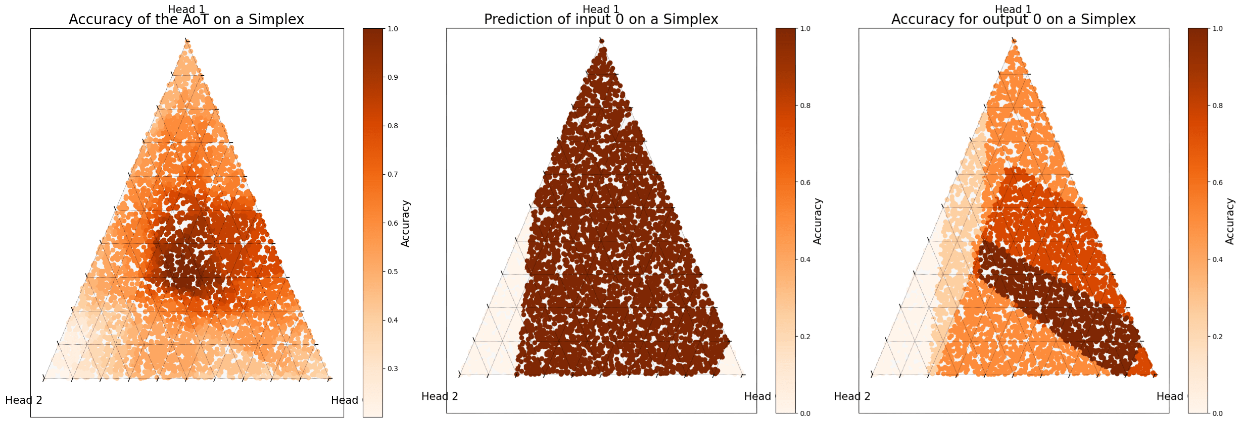 Let us start with the Simplexial plots: we produce triangle shaped plot of the accuracy where the proportion of each head varies, for the whole dataset, one input, or for all input that have the same output.