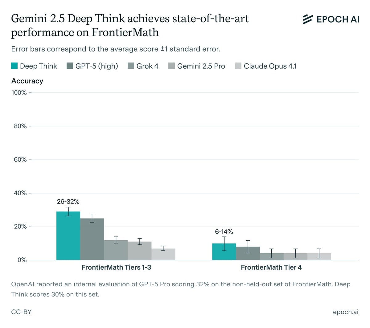 Epoch runs the numbers manually for lack of an API and finds that the public version of Gemini 2.5 DeepThink is the new leader at FrontierMath.