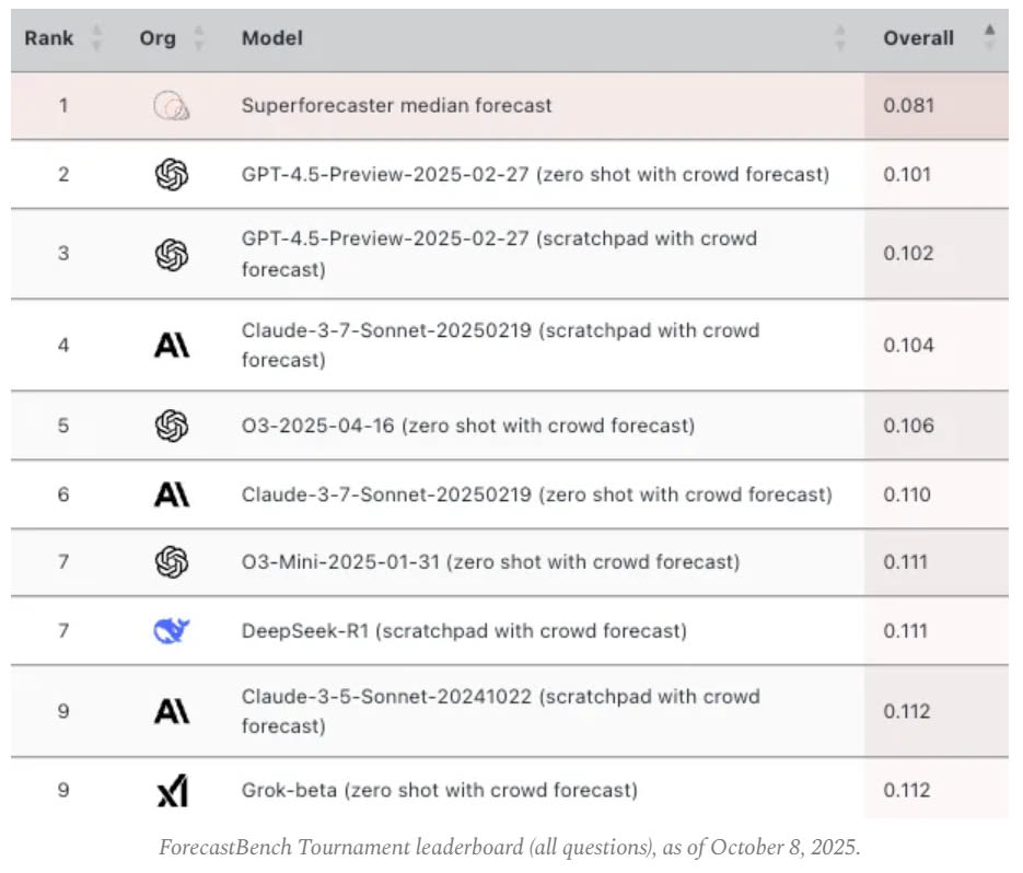 ForecastBench has been updated, and LLMs are showing a lot of progress. They are still behind ‘superforecasters’ but ahead of non-expert public prediction participants, which themselves are surely a lot better than random people at predicting. This is with a relatively minor scaffolding effort, whereas I would expect for example hedge funds to be willing to put a lot more effort into the scaffolding than this.