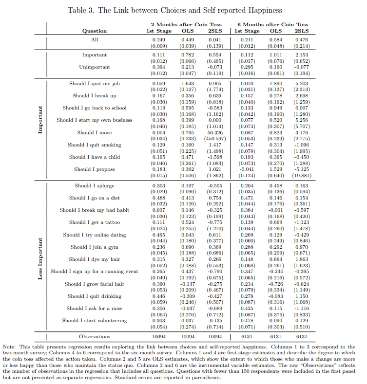 Pretty much the whole causal estimate comes down to the influence of happiness 6 months after quitting a job or breaking up. Almost everything else is swamped with noise. The only individual question with a consistent causal effect larger than the standard error was "should I break my bad habit?", and doing so made people unhappier. Even for those factors, there's a lot of biases in this self-report data, which the authors noted and tried to address. I'm just not sure what we can really learn from this, even though it is a fun study.