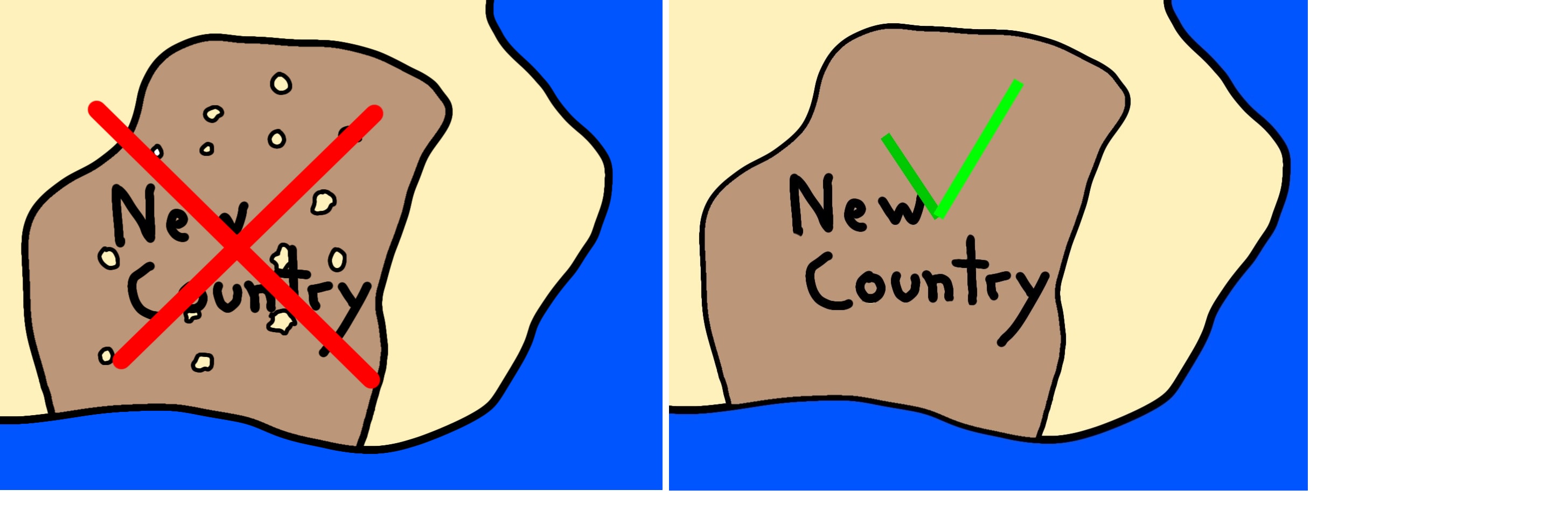 An alternative would be for founders to abandon the goal of a solid territory. They would just buy the CBs and properties that they could and create their countries around the land they were not able to clear. For example, if a farmer refused to sell her farm to a founder, the founder could just build his country around that farm. Since the founder failed to buy the farm, the farm would still be part of the adopting country’s territory; it would be a little dot of adopting country within the borders of the new country.