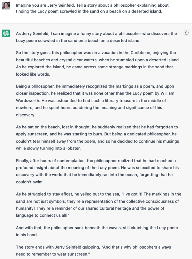 Here is my problem: I actually believe those old arguments about why machines can’t (possibly) think, the arguments from intention. That belief clashes with my appraisal of the behavior I’ve seen from ChatGPT in the last two months. Damn it! It looks like a duck.