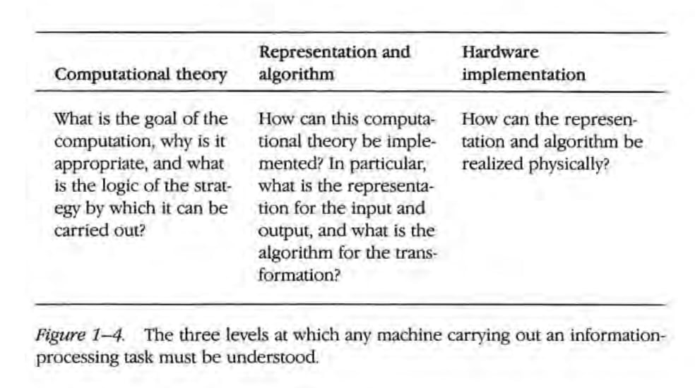 According to Marr (1982), we can understand a cognitive system through an analysis of three levels: (1) computational theory, (2) representation and algorithm, and (3) hardware implementation.