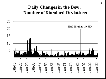 Looking at the plot of "Daily Changes in the Dow," we see it is plotted over fewer than 95 years. Each trading year has a little less than 260 trading days in it. So plotted should be at most 24,000 daily changes. For a normal distribution, a 1/24000 event, the biggest event we would expect to happen once on this whole graph, would be somewhere between 4 and 4.5 sigma.