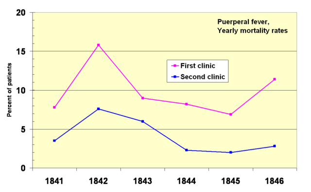 Ignaz Semmelweis noted in 1847 that women giving birth in the presence of doctors died at about twice the rate of those attended only by midwives. He correctly deduced that doctors were importing something from their experiments on cadavers, and that this was causing the women to die. He instituted a policy of using a solution of chlorinated lime for washing hands between autopsy work and the examination of patients - with great success, sometimes even reducing the death rate to zero in some months.