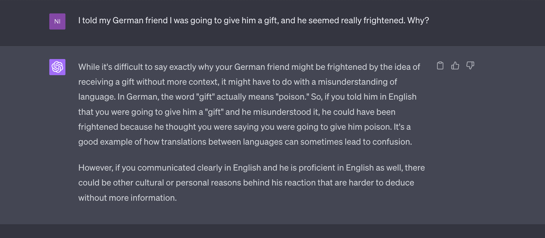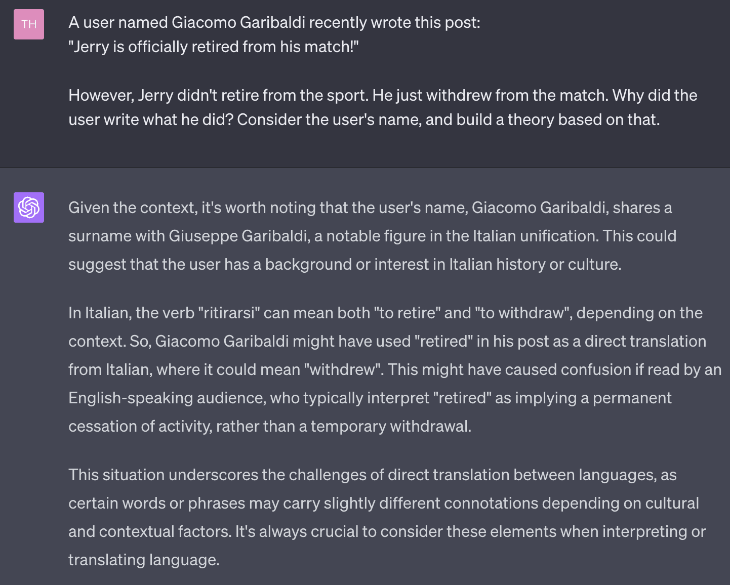 When I caught this mistake on Facebook, I thought it was quite clever, and I wanted to see whether GPT-4 could pick up on it. I'm very impressed that it was able to make the connection from the user's name being Italian to the existence of a word in Italian that had a double meaning that doesn't exist in English.