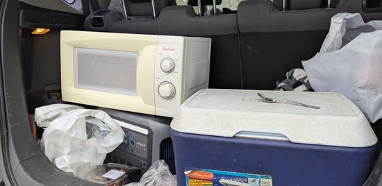 We have an old (light!) microwave [1] and I recently got a portable power station (battery). We combine this with a cooler (pasta, rice, cheese, sauce, freezer pucks, etc) which gives a lot of options for tasty warm food.