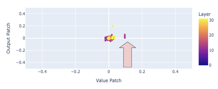 Following along the lines of the Indirect Object Identification analysis, I scatter plot the output patch score against the value patch score in the figure below.