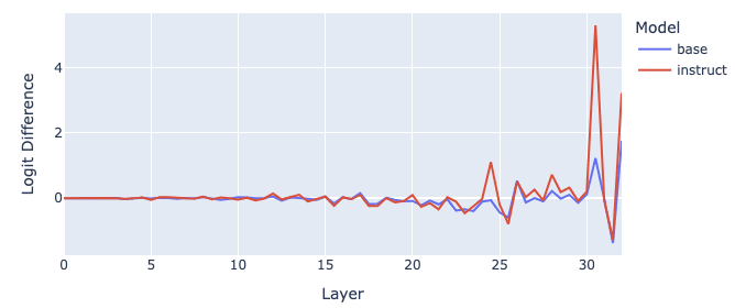 The Layer Attribution plot above shows that INSTRUCT has a strong signal from the attention at layer 30 and the MLP at layer 31. Specifically, the attention head L30H31 (INSTRUCT) contributes to a logit difference of 5.7, while L30H31 (BASE) contributes to a difference of 2.13. This head suppresses the “quick” logit in BASE and more efficiently in INSTRUCT, implying that the copy suppression is enhanced in INSTRUCT.