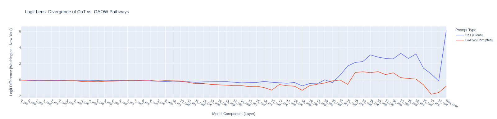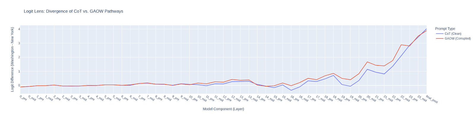 Figure 1: Logit Lens Divergence of CoT vs. GAOW Pathways