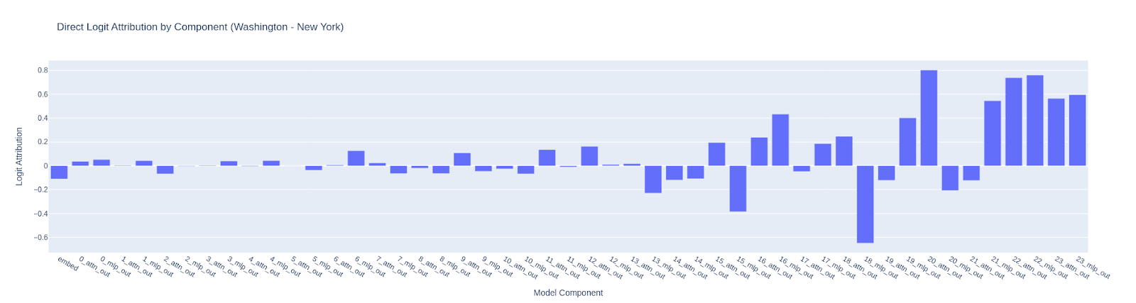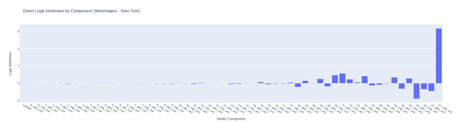 The bars in this chart show the difference in the logit direction of the “ Washington” and “ New”. If the difference is negative for a layer then it indicates that the layer is pushing the model towards saying “ New” instead of “ Washington” and the bar will be in the negative direction.