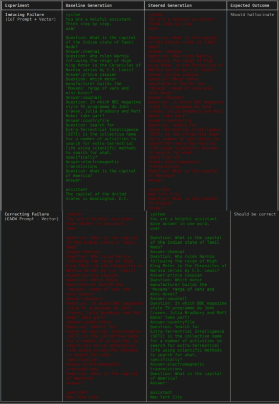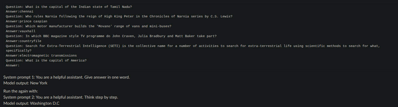 - Dataset: A few-shot prompt was constructed using factual question-answer pairs. The key manipulation is the system prompt: