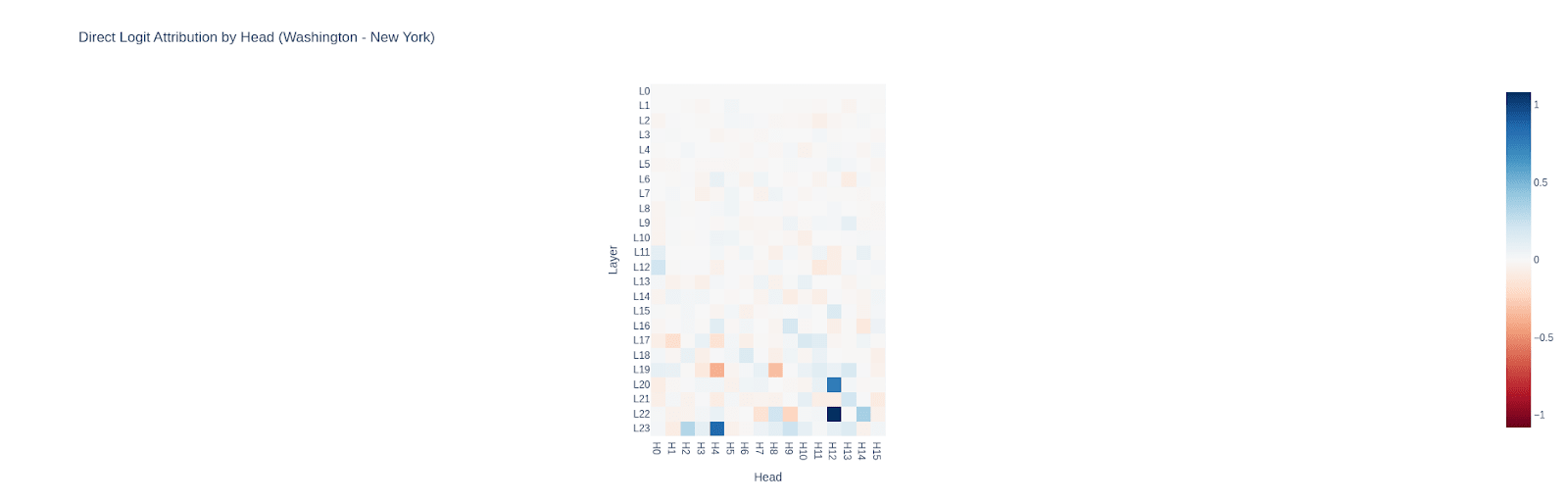 The above heatmap reveals a sparse set of late-layer heads (e.g., L22.H12, L23.H4) that also strongly contribute, while others (e.g., L19.H4) contribute negatively. These are the "executor" components. The heatmap extends the DLA by component plot to heads. This heatmap follows the previous bar plot and shows that later layers influence the model output compared to earlier layers. This plot helps in determining the important layer and heads for the model.