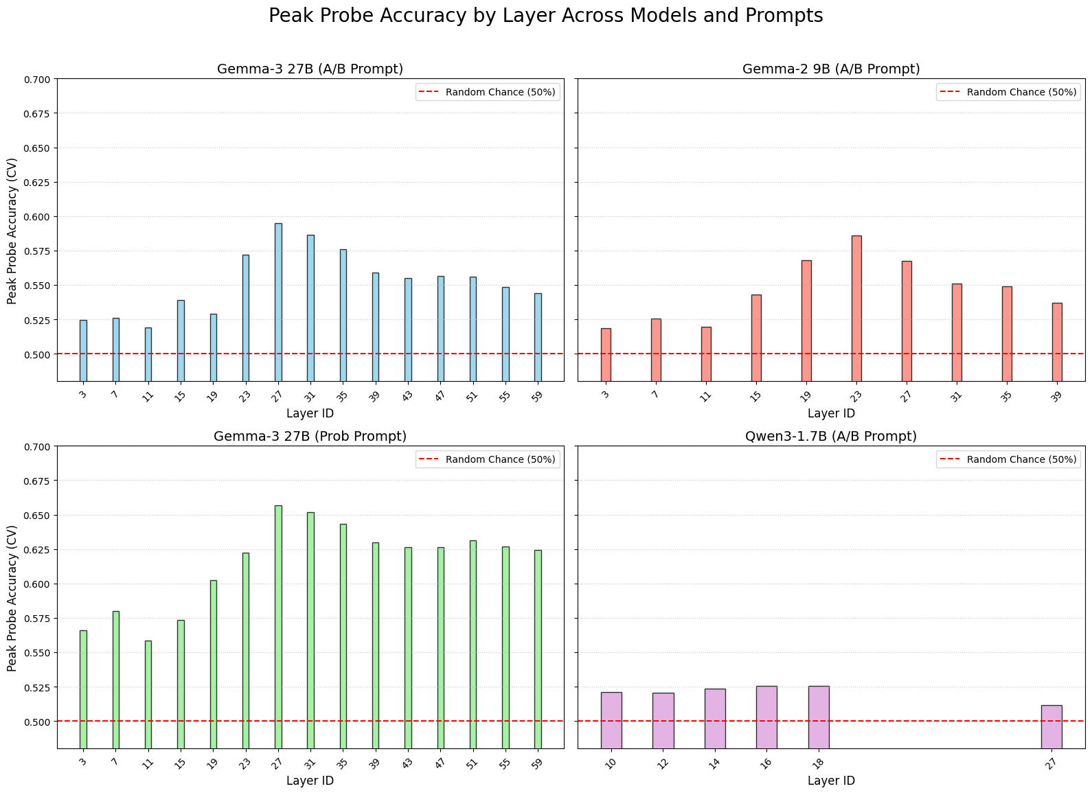 I think that on Qwen-1.7B, the probes might be less accurate, but I wouldn't conclude that definitely since the model had 73% accuracy vs. Gemma3-27B's 86%, so it might be the model that underperforms instead of the probes, and also the confidence interval is wider since on Qwen, I used 250 questions instead of 500.