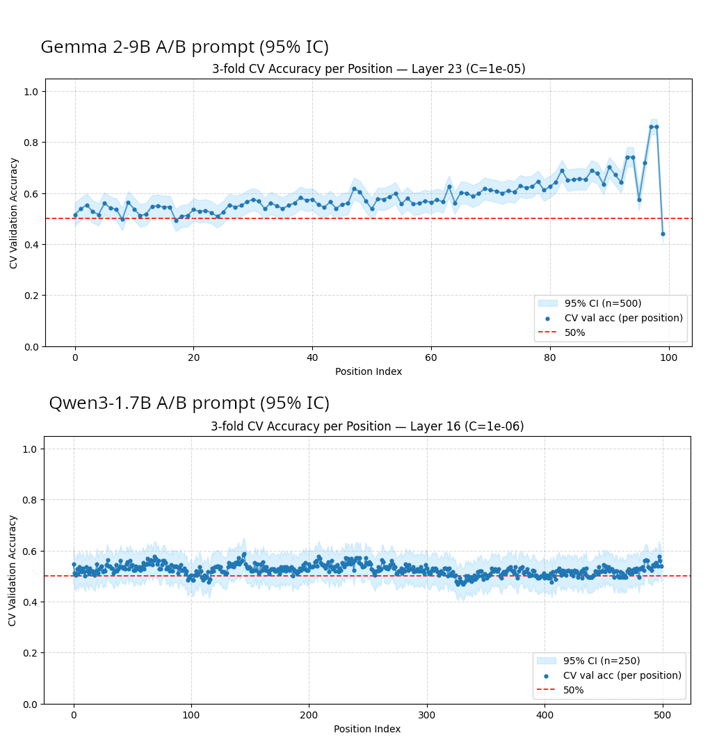 To investigate when a model forms its belief, I trained probes on activations from the final 100 tokens of the reasoning chain. For our primary model, Gemma-3-27B, on the A/B prompt, probe accuracy remained near random chance until the final 40 tokens, where it started slowly increasing, only spiking to the actual model’s performance in the last 10 tokens. As a comparison, the chain of thought is on average 260 tokens long. This suggests the final answer is mainly computed at the final position.