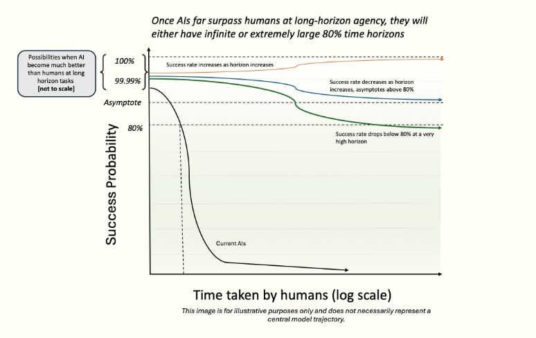 However, we see here that there's an alternative: humans take a longer time on the time horizons because there are lots of steps, and the stochastic nature of modern LLMs leads to them making a critical error at some point along the path. Importantly, when taking this perspective, so long as there's at least a little bit of randomness and unrecoverable errors have non-0 probability, it is impossible to have an actually infinite time horizon, because there will always be an error at some point over an infinite time frame, so the success rate will always tend to 0.[6]