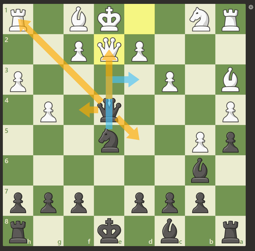 Example moves considered by an intermediate player (yellow) vs correct move (blue). The player knows that their queen is under attack, and so considers moves which directly fix this, ignoring the correct move, a check forcing the opponent to move their king.