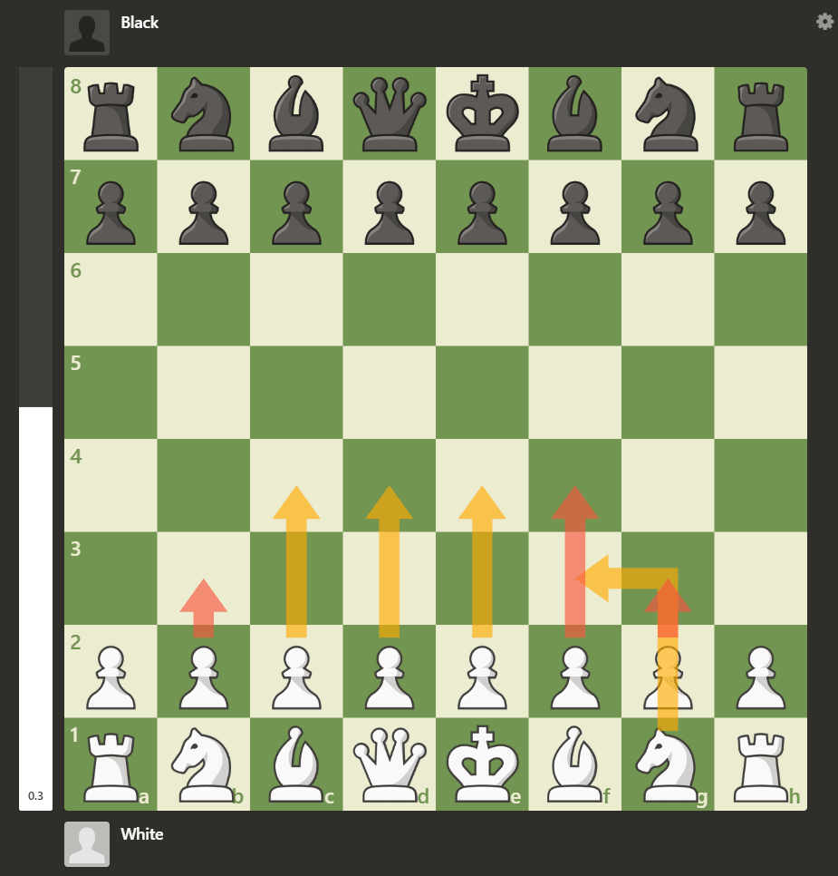 Possible moves according to a strong player. Moves in red are only considered by particularly spicy players (I'm quite partial to b3 myself).
