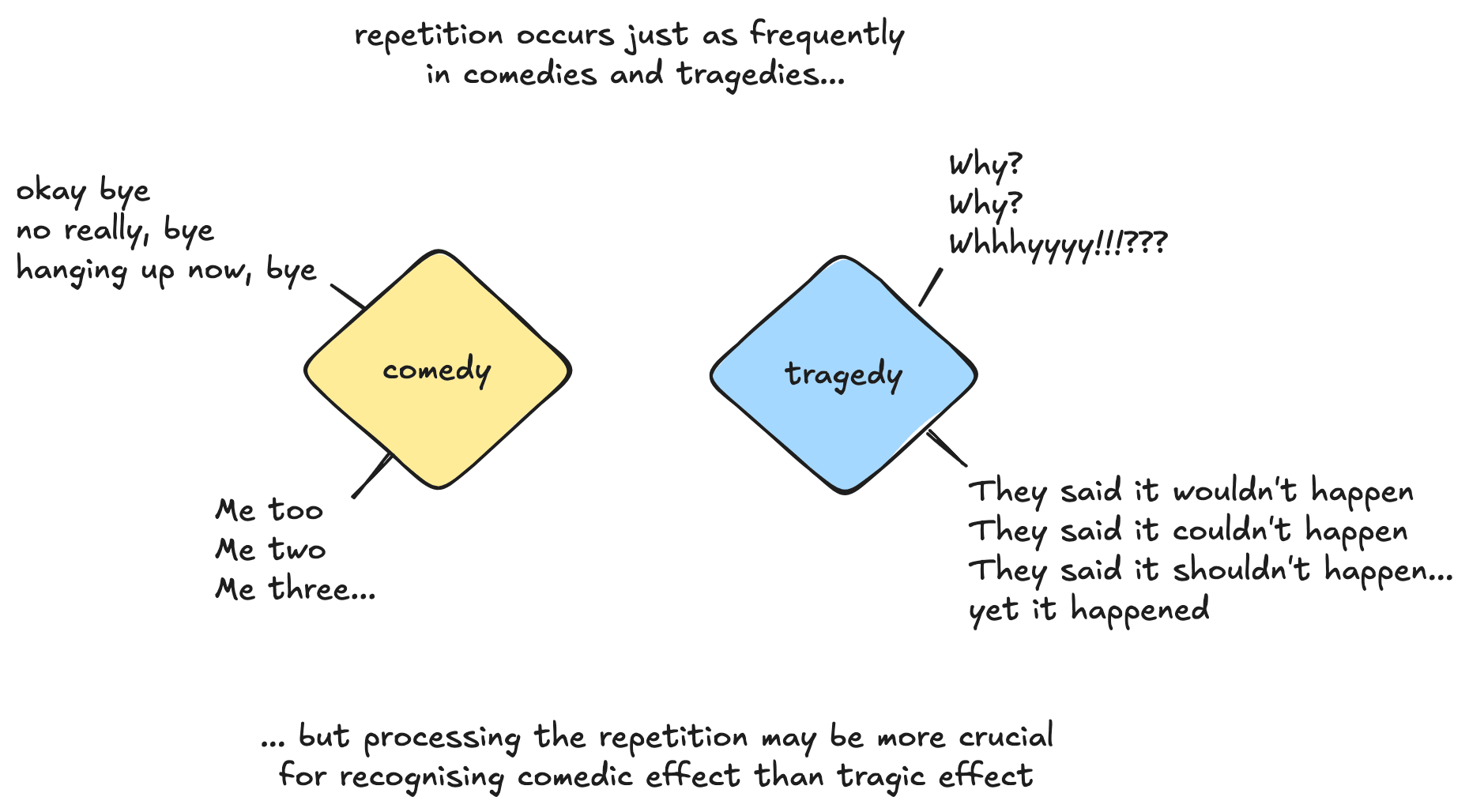 An example of a feature that might be especially important in the context of a Comedy, but less important in the context of a Tragedy, is a repetition detector. There may be a feature which fires when repetition is present, and this may be crucial for interpreting comedic devices.