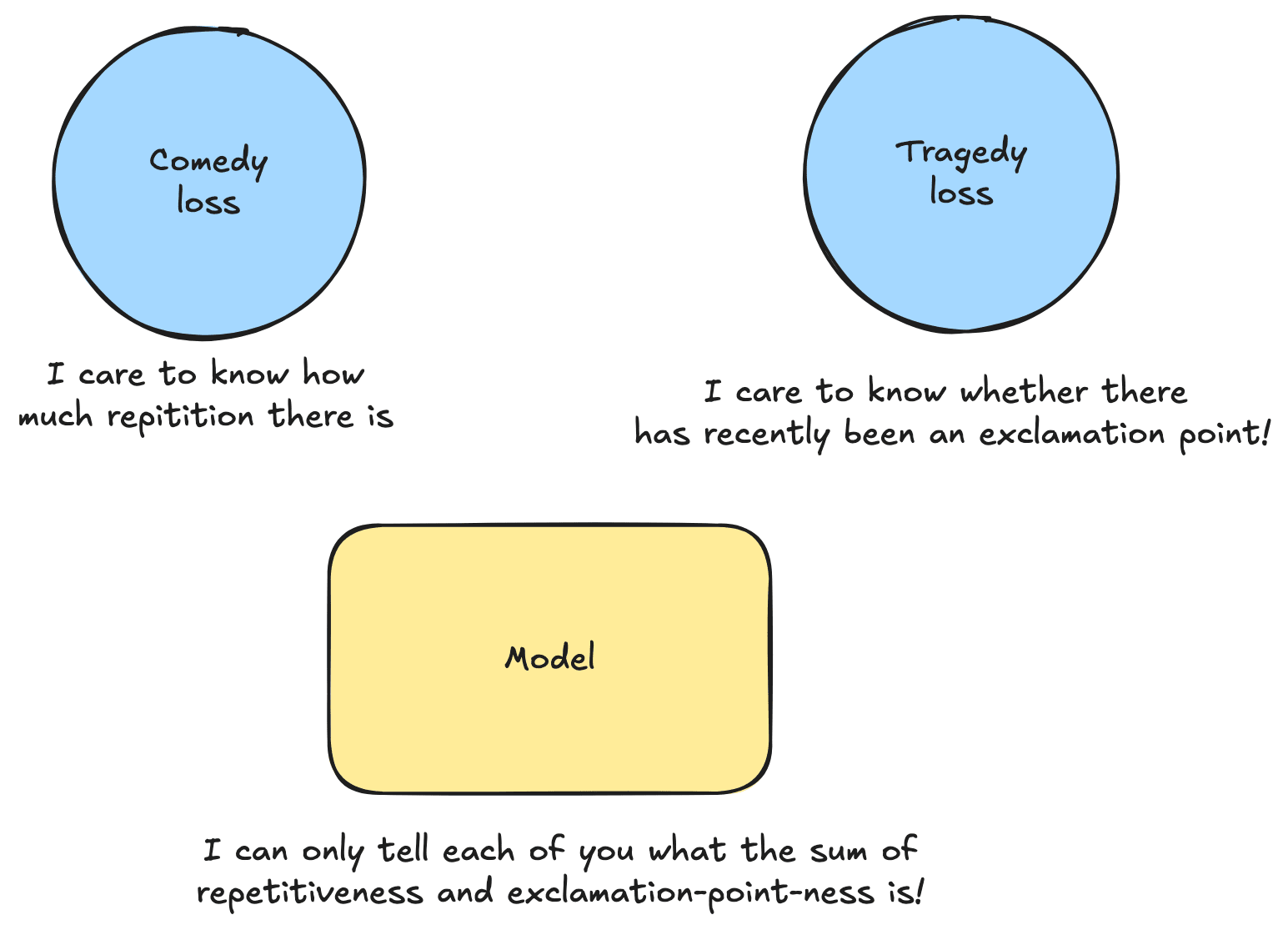 We have a language model, trying to predict the next word in a sequence. Samples from our dataset can fall into one of two categories: Comedy or Tragedy. Conditional on our sample being a Comedy, features to might be especially important, whereas conditional on our sample being a Tragedy, features to might be especially important.