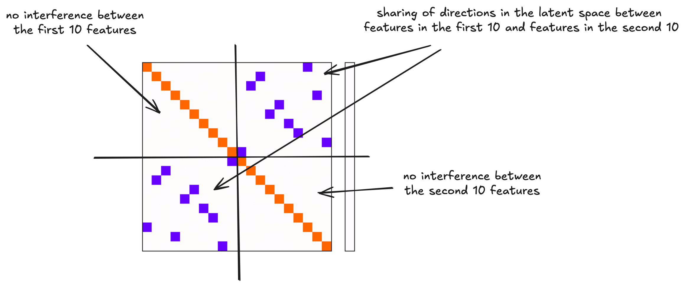 Note: this makes the simplifying assumption that and share exactly the same direction in the latent space, and interfere with no other features.