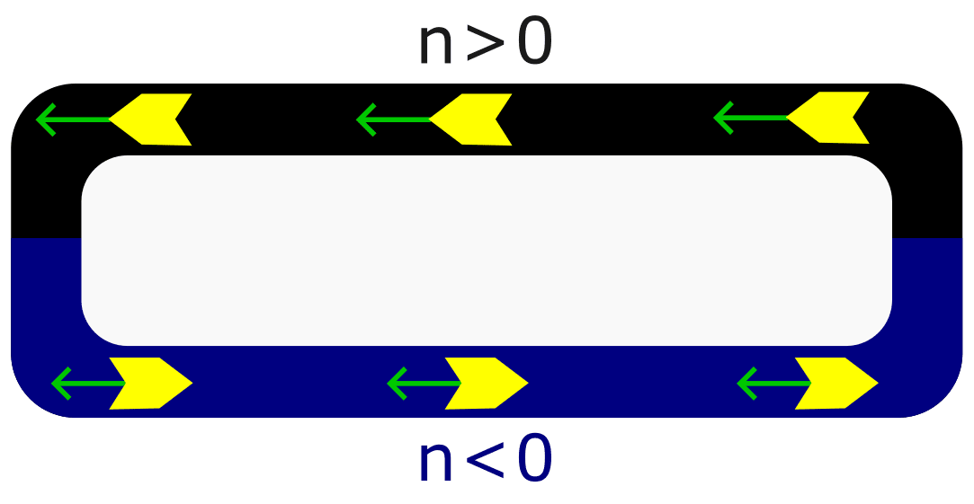 This is a sketch of the idea. The photons (yellow kites) go in circles, with propagation direction shown by the kite points. Their momenta (green allows) are in the same direction for most of the loop, so that the total resultant momentum increases as more photons are added. My current weakly held position is that despite appearing mad I think this might in-principle actually work, based mostly off the way momentum conservation of Cherenkov radiation in negative index materials works[10]. Note that, if Minkowski is "just right" then you don't even need negative refractive index materials. You just make the backward part of the loop a higher index material than the forward part. This way the photons have more momentum while going backwards, and also, averaging over time, spend more time travelling backwards that forwards. In contrast, Abraham (with positive index materials) doesn't allow this as the photons spend less time going in the direction in which they have more momentum, so the time average momentum of each as it loops comes to zero. As I find the proposal itself intrinsically somewhat implausible (it is a maximally aggressive violation of the uniform motion of the centre of mass of an isolated system), I think the fact Abraham is somewhat opposed to it working is a weak update in favour of something Abraham-like.