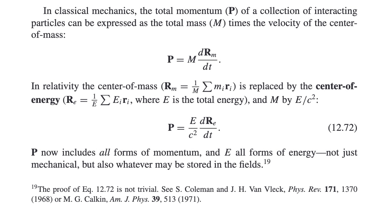That said, the hypothetical you give is cool and I agree the two principles decouple there! (I intuitively want to save that case by saying the COM is only stationary in a covering space where the train has in fact moved a bunch by the time it stops, but idk how to make this make sense for a different arrangement of portals.) I guess another thing that seems a bit compelling for the two decoupling is that conservation of angular momentum is analogous to conservation of momentum but there's no angular analogue to the center of mass (that's rotating uniformly, anyway). I guess another thing that's a bit compelling is that there's no nice notion of a center of energy once we view spacetime as being curved ( https://physics.stackexchange.com/a/269273 ). I think I've become convinced that conservation of momentum is a significantly bigger principle :). But still, the two seem equivalent to me before one gets to general relativity. (I guess this actually depends a bit on what the proof of 12.72 is like — in particular, if that proof basically uses the conservation of momentum, then I'd be more happy to say that the two aren't equivalent already for relativity/fields.)
