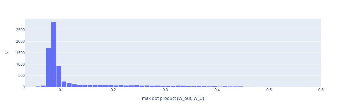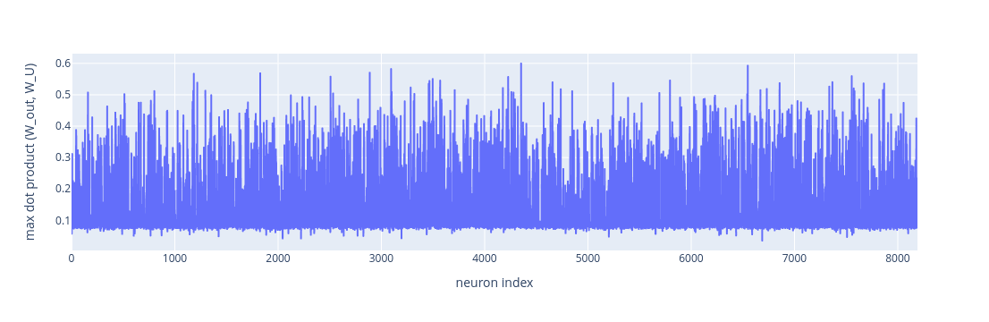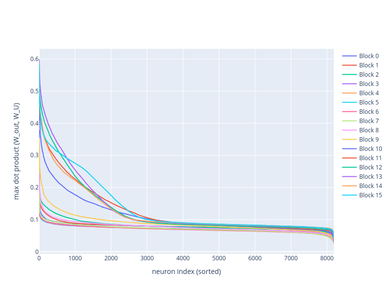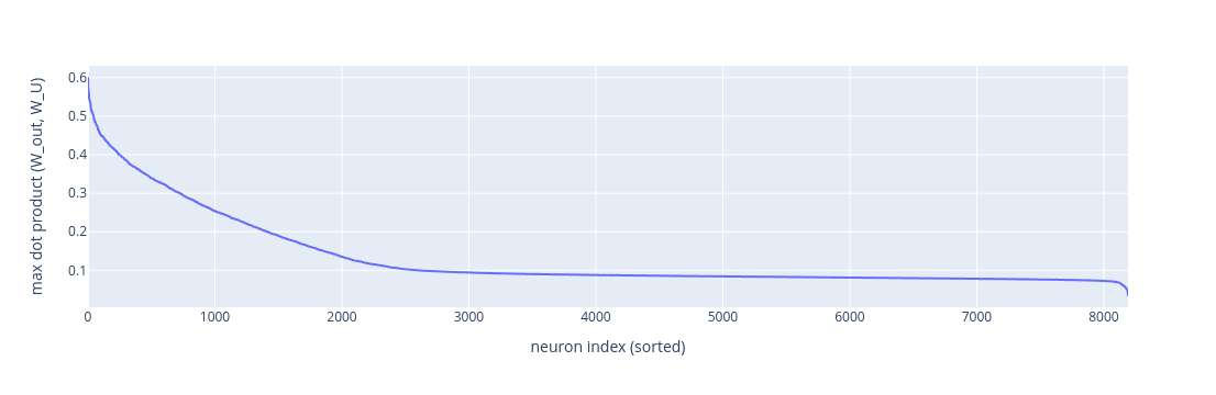 Sorting the neurons my max dot product highlights the distribution even better: there is a significant number of neurons with outputs that are aligned with vocabulary embedding.