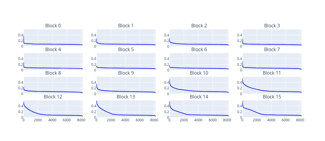 This visualization can be repeated for MLPs in all other layers. Looking at all the distributions, majority of neurons that are stronger aligned with the vocabulary are in the later blocks: