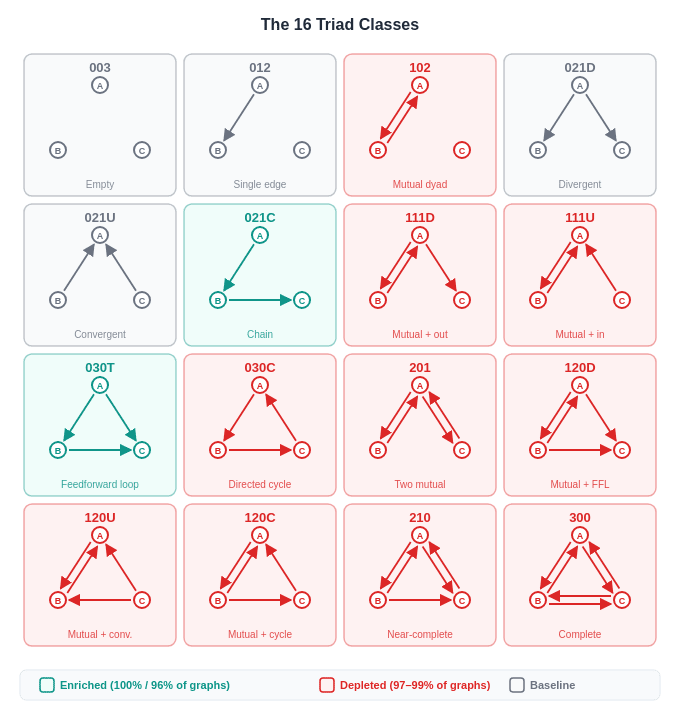 For directed networks, the standard approach is the triad census [9]: a complete classification of all 16 possible 3-node directed subgraphs. Each network gets a motif profile, a vector of Z-scores, that serves as a structural fingerprint. Milo et al. [7] showed that these fingerprints can classify networks from entirely different domains (gene regulation, neural connectivity, electronic circuits) into structural "superfamilies," meaning the method captures something about computational organization that generalizes beyond the given substrate.