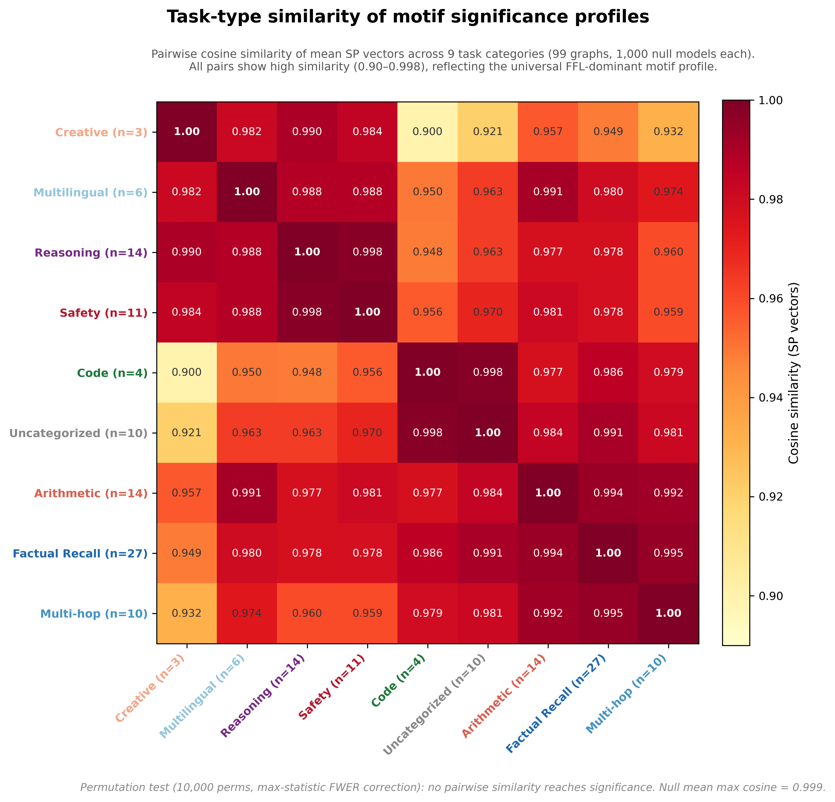 All task-type pairs show high cosine similarity (0.90–0.998), reflecting the dominance of the universal FFL/chain enrichment pattern across all graph categories. A permutation test (10,000 label shuffles, corrected for 36 pairwise comparisons) confirms that no pair is significantly more similar than expected by chance and randomly grouped graphs converge toward the global mean profile even more tightly than the real task groupings do. The high absolute similarities reflect a shared wiring signature but not task-specific clustering.