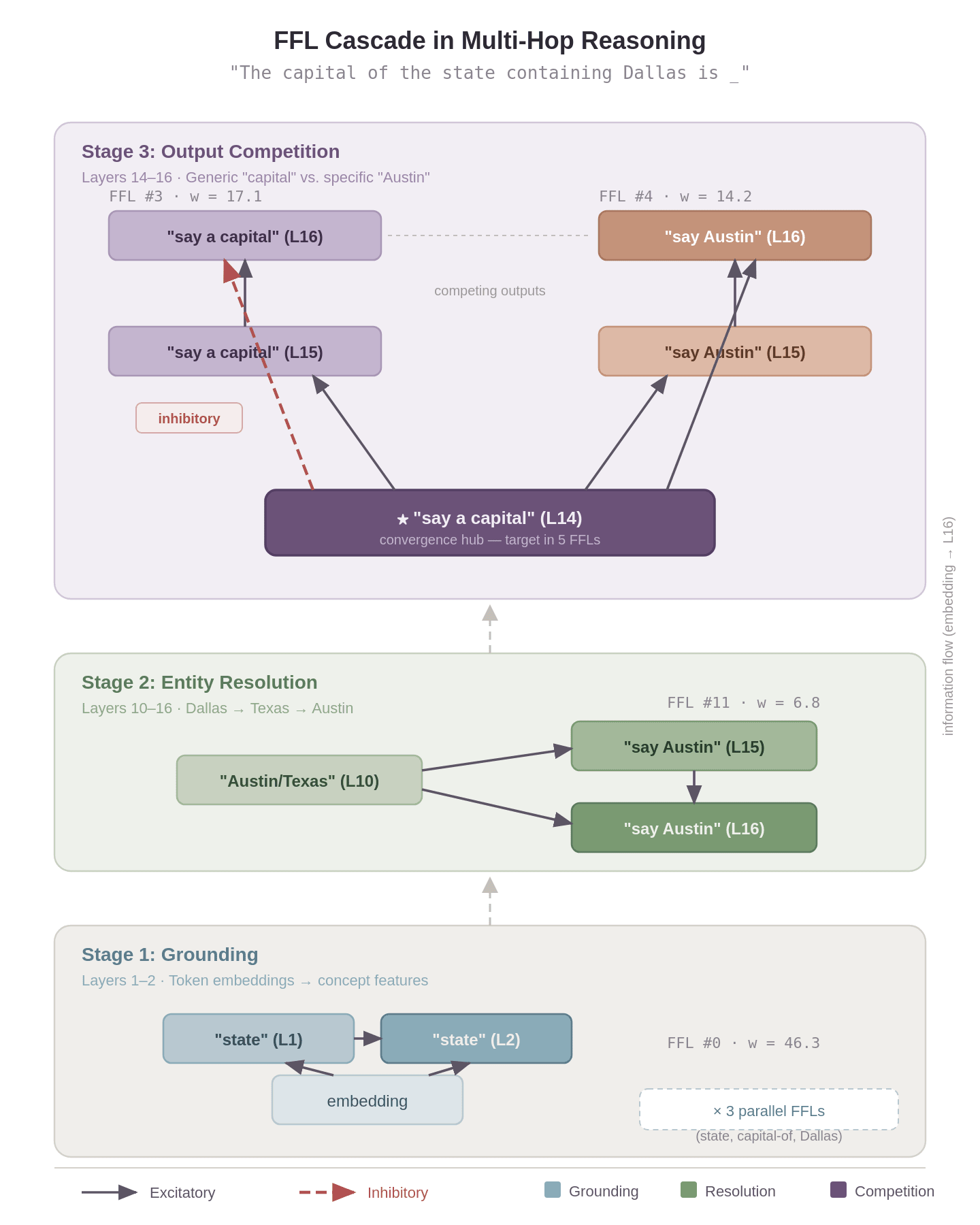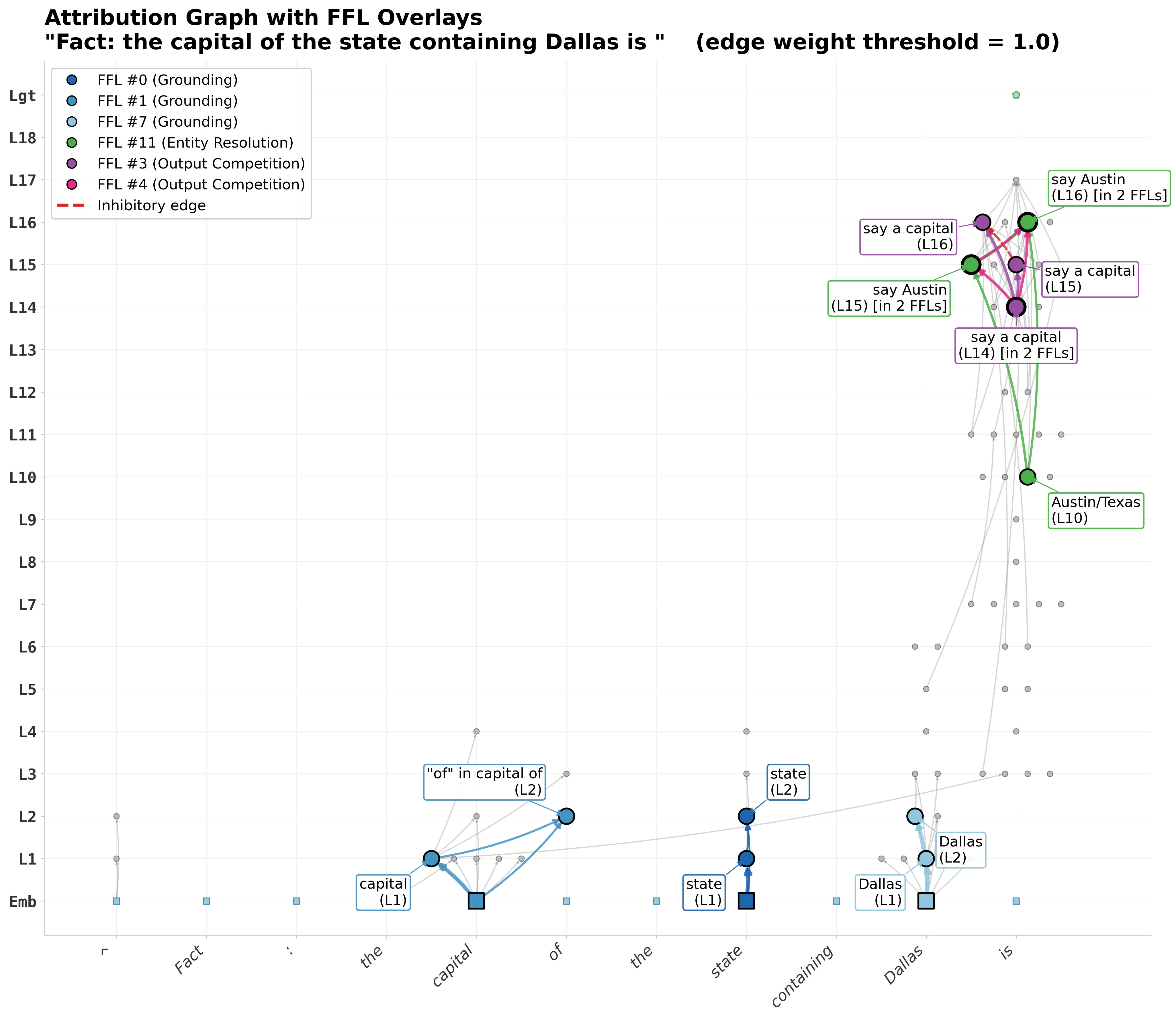 Stage 3 — Output Competition (Layers 14–16). Two FFLs converge on a shared node, "say a capital" at L14, which serves as the target in five different FFLs across the full graph, making it a convergence hub. This is where the model decides between the generic response ("a capital") and the specific answer ("Austin"). FFL #3 (w = 17.1) propagates the generic "capital" concept forward from L14 through L15 to L16, but its direct shortcut edge from L14 to L16 is inhibitory (the only negative-weight edge among all six FFLs). This creates a self-suppression mechanism where the generic response is partially dampened at the final layer. Meanwhile, FFL #4 (w = 14.2) channels the abstract "capital" representation at L14 into the specific entity "Austin" at L15 and L16, with all edges excitatory. The competition resolves and the correct-answer pathway is fully reinforced while the generic pathway brakes itself.