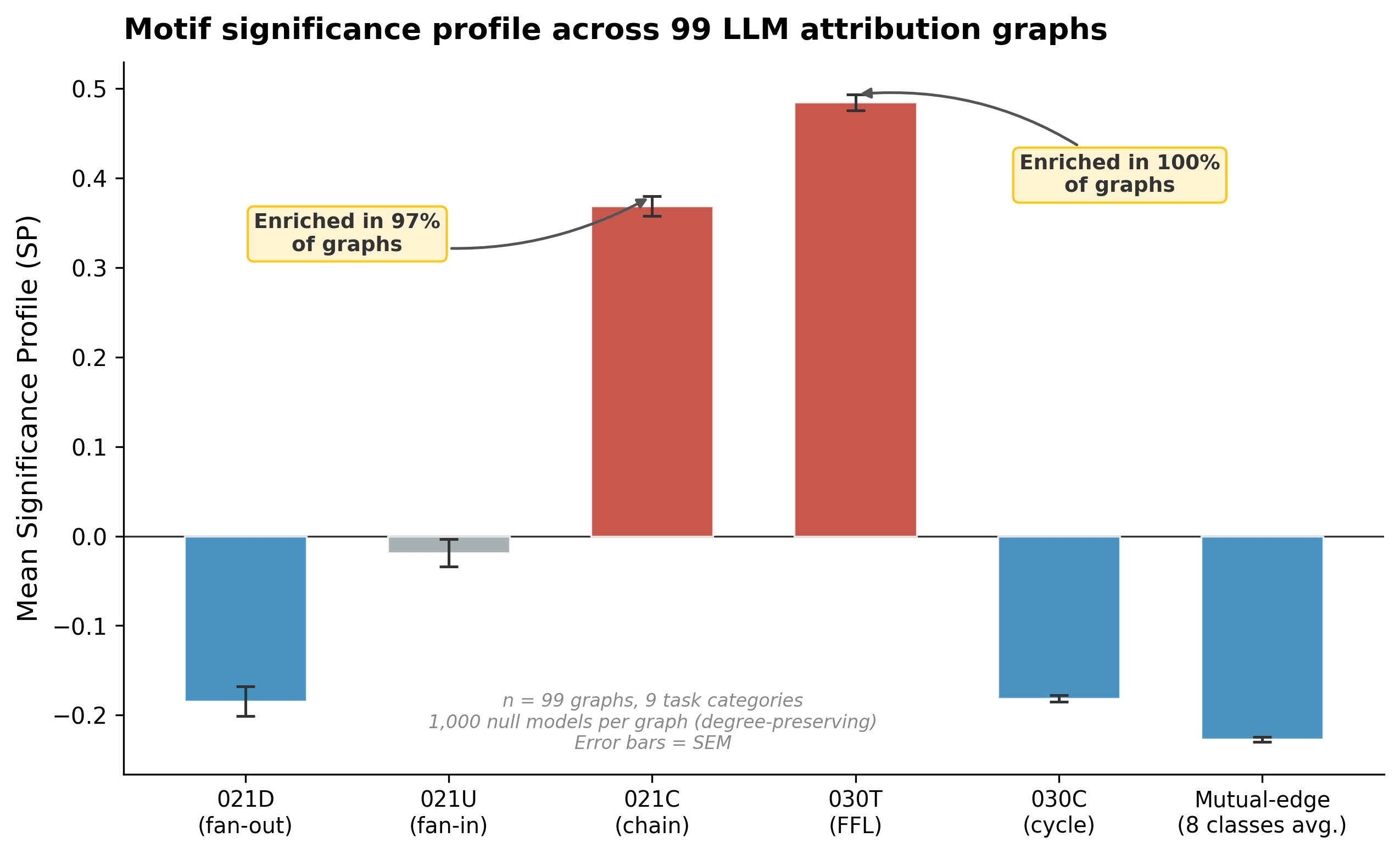TL;DR: Analyzing attribution graphs manually is tedious and doesn't scale. To help automate some of this process, I ported network motif analysis (the technique Uri Alon used to decode gene regulatory networks) into a tool for automatically fingerprinting the structural properties of transformer circuits. I ran it on 99 attribution graphs from Neuronpedia. As expected, the graphs are dominated by feedforward loops (FFLs), confirming that the tool recovers structure that Anthropic had previously observed qualitatively in individual circuits. The more interesting findings: (1) when I trace individual FFLs in a concrete circuit, they chain into multi-stage processing cascades with structurally distinct roles: grounding, entity resolution and output competition via inhibitory edges; (2) motif profiles reveal a universal structural backbone across all task types, with task-specific modulations in the magnitude of individual motifs. The tool (circuit-motifs) is open source and runs on any attribution graph from Neuronpedia.