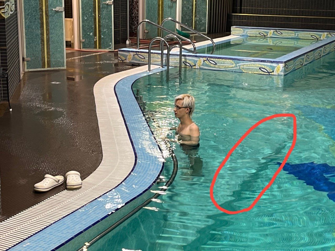 Background: Swimming Pool I visited a new swimming pool and started swimming in circles. I can swim, but I experience stress anticipating that if I run out of strength or disrupt my swimming technique, I might involuntarily sink underwater, water would get into my ears, and my eyes would sting badly, as in the past—significant stress, but the biggest stress of course is if water gets into my nose or throat, because it would be unexpected. Fear of drowning.