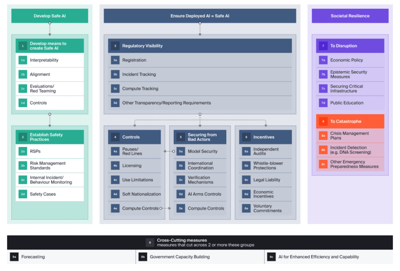Under Societal Resilience to Disruption, I think "Epistemic Security Measures" could be fleshed out more. The first thing that pops to mind is letting people tell whether some content or message is from an AI, and empowering people to filter for human content / messages. (Proposals range from legislation outlawing impersonating a human, to giving humans unique cryptographic identifiers, to something something blockchain something Sam Altman.)