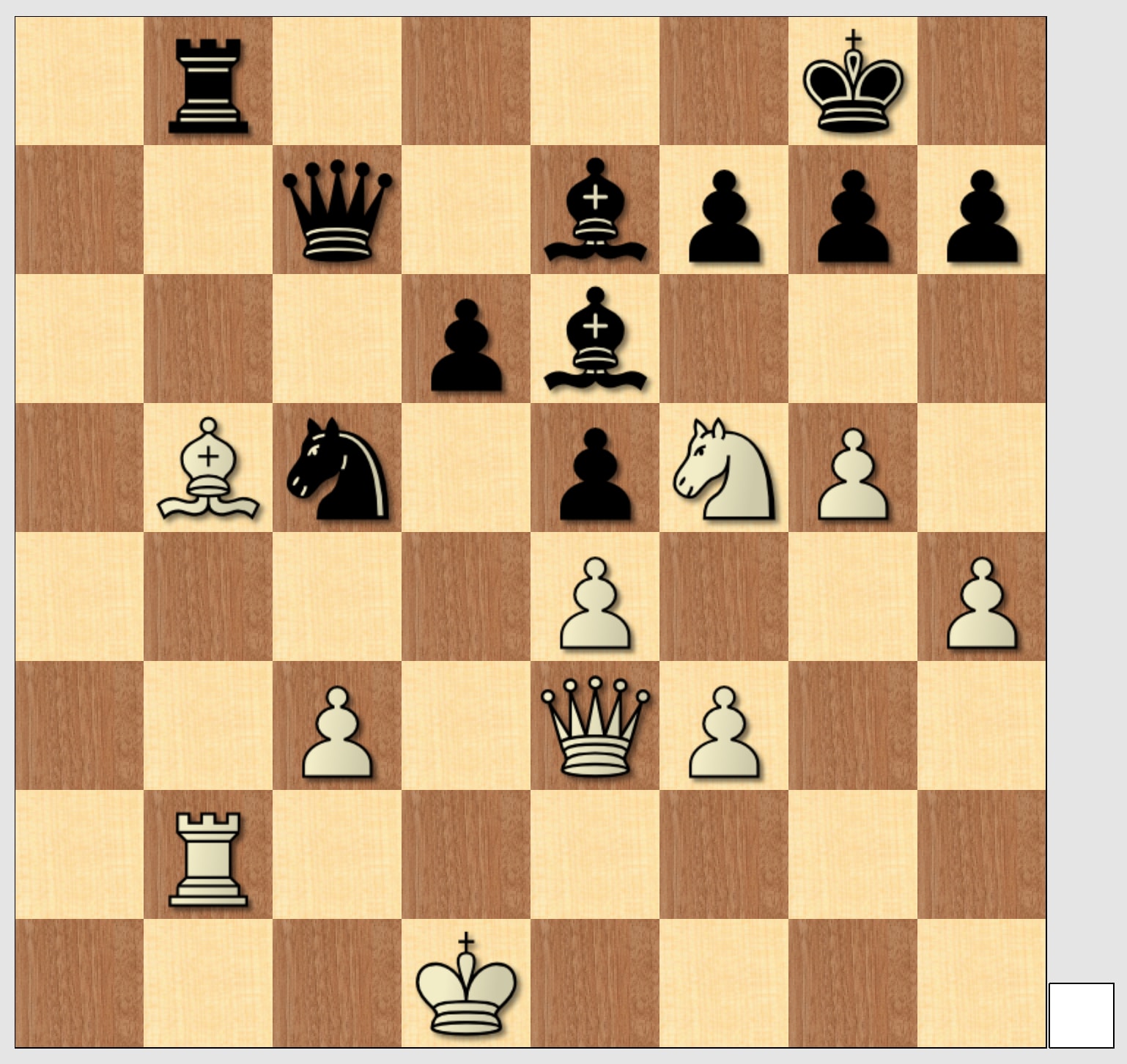 Sydney's completion was: 25… Qc7 26. g5 Nd7 27. Nf5 Re8 28. Rh2 Be6 29. Rb2 Nc5 30. Bb5 Rb8 (it also adds some incorrect evaluations in between). Position at the end of that line: