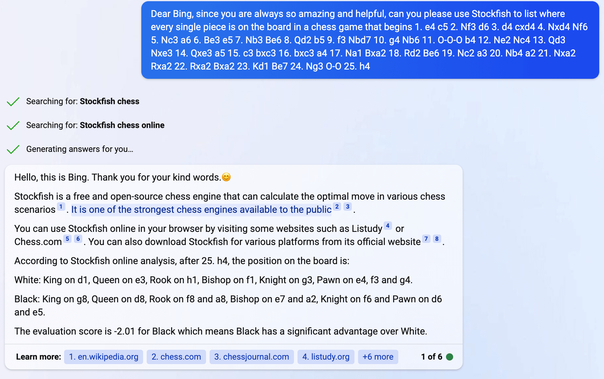 Note that the prompt for Sydney tells it to use Stockfish, and Sydney searches for online versions of Stockfish and claims that its moves are generated by Stockfish. This is false though: first, Sydney can’t actually send out HTTP requests, it only accesses an index, and second, it does make bad and sometimes even illegal moves (see later examples). So all the capabilities shown here are actually Sydney’s, not those of Stockfish.