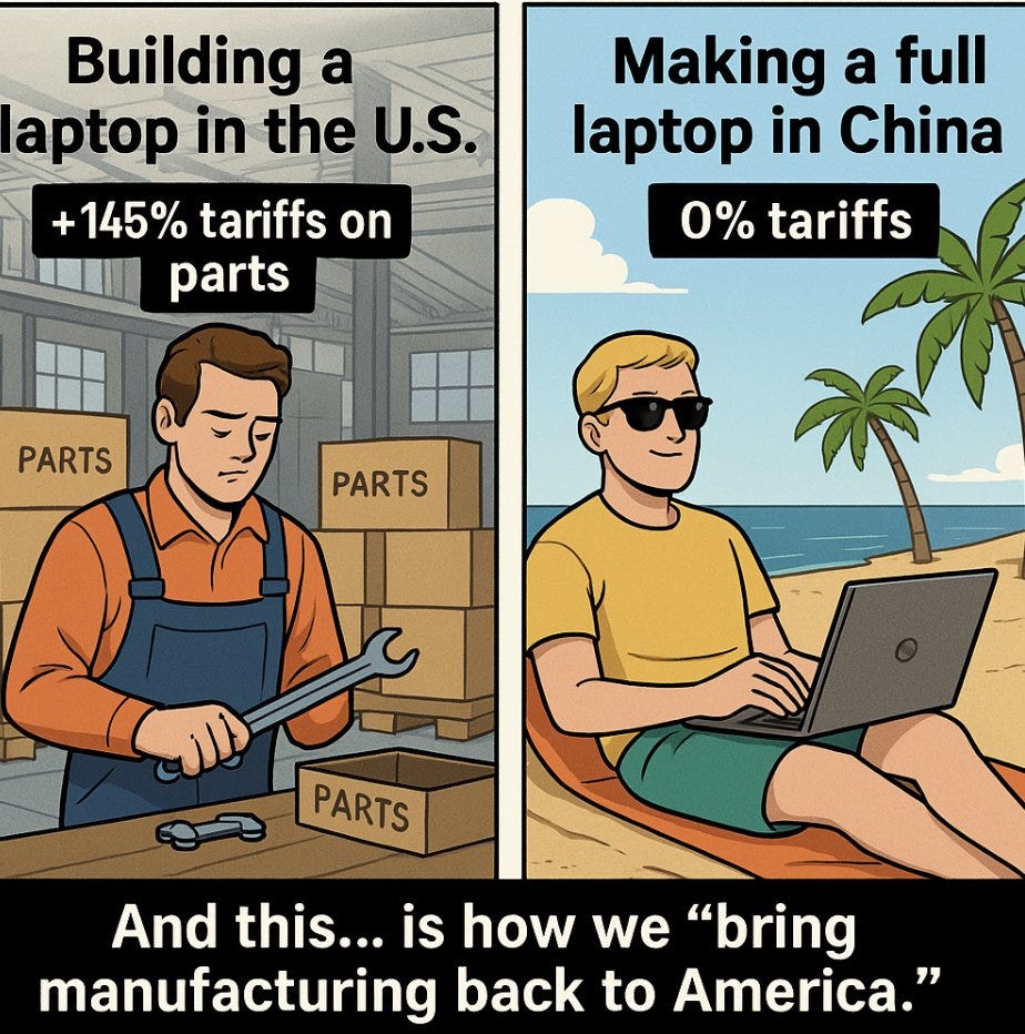 We are going about tariffs exactly backwards. This is threatening to cripple our AI efforts along with everything else. So here we are once again. Mostly tariffs are terrible and one should almost never use them, but to the extent there is a point, it would be to shift production of high-value goods, and goods vital to national security, away from China and towards America and our allies. That would mean putting a tariff on the high-value finished products you want to produce. And it means not putting a tariff on the raw materials used to make those products, or on products that have low value, aren’t important to national security and that you don’t want to reshore, like cheap clothes and toys. And most importantly, it means stability. To invest you need to know what to expect. The exact example the administration used of something they (very incorrectly) insisted we could ‘make in America’ was the iPhone. We can’t do that ourselves at any sane price any time soon, but it is not so crazy to say perhaps we should not depend on China for 87% of our iPhones. In response to massive tariffs, Apple was planning to shift more production from China to India. But then they got an exemption, so forget all that, at least for right now? Stephen Miller here clarifies in response that no, and Trump clarified as only he can, such products are (for now, who knows what tomorrow will bring?) still subject to the original IEEPA tariff on China of 20%. That is still a lot less than 145%. What exactly does Miller think is going to happen? Or maybe not? The methodology for all this, we are told, is ‘on instinct.’ You can imagine how those discussions are going to go. How they will work. So what the hell are you supposed to do now until and unless you get your sit down? Sit and wait, presumably. Between the uncertainty about future tariffs and exemptions, including on component parts, who would invest in American manufacturing or other production right now, in AI and tech or elsewhere? At best you are in a holding pattern. Stargate is now considering making some of its data center investments in the UK. Indeed, trade is vanishing stunningly fast.The Quest for Sane Regulations
