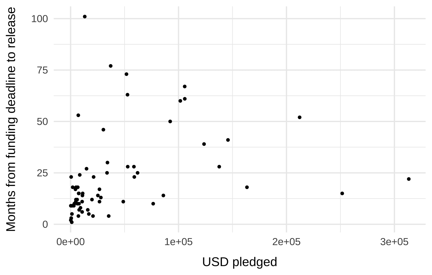It seems likely that the more funded games are more complicated. For instance, funding amount and time from funding deadline to release were correlated for the 65 projects whose release dates I could find (p = 0.015, Spearman correlation test). I think this could be because projects receiving more funding were more complicated or harder to make. (You can see this correlation visually when you log the X axis. If someone could explain to why that's the case, that'd be much appreciated!)