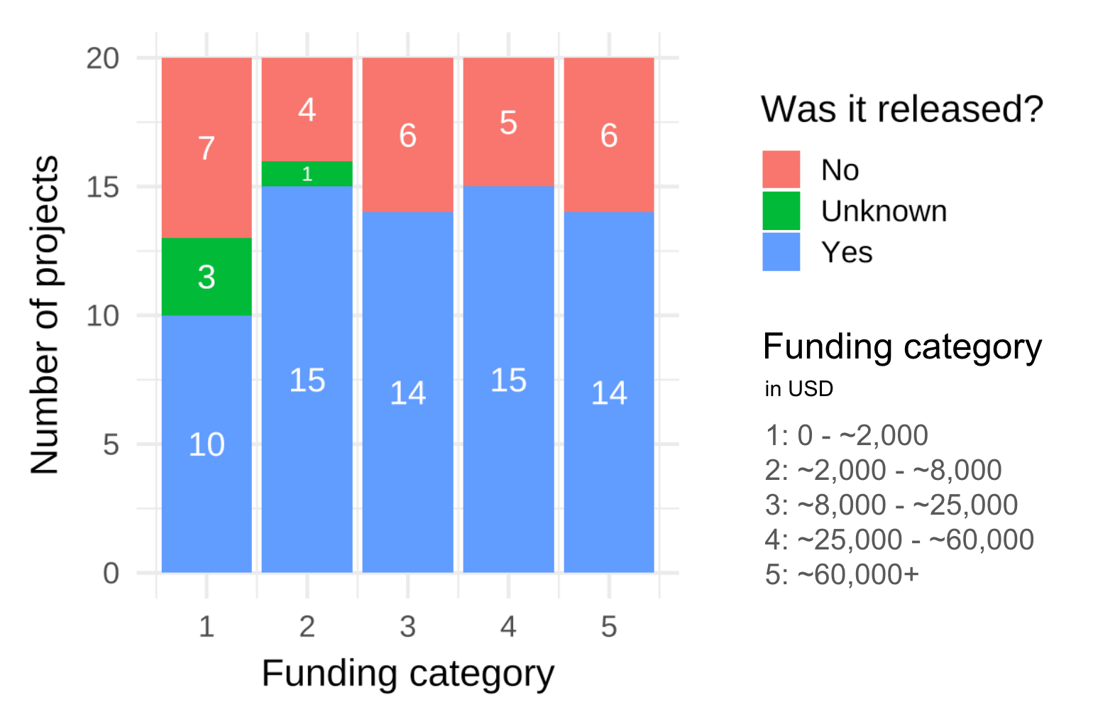 So, while that research had found a failure rate of ~12% for fully-funded video games, I found a substantially higher rate. Of the 100 games that I looked at with funding deadlines in 2014, I could confirm that 68 of them had been released. There were 4 projects where I was unclear about whether they had produced anything, and the other 28 games seemed to have never come to fruition. Only one of these 28 seemed to not have been abandoned.
