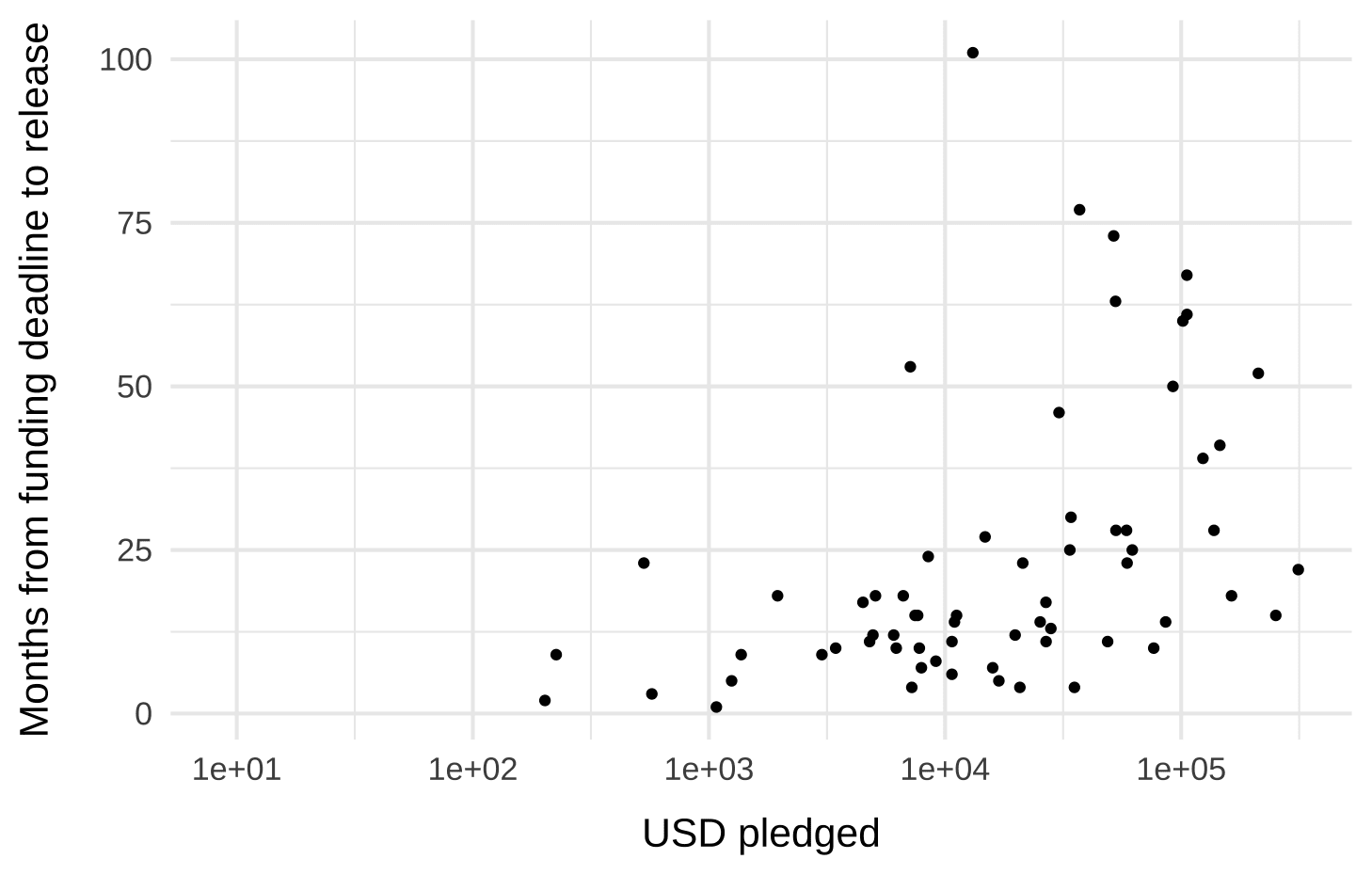 Each point represents one project. Each point's x coordinate represents how much funding it received (i.e. how much USD was pledged.) Each point's y coordinate represents the number of months between when the project stopped collecting funding to when the game was released. This is the same as the above, but the x axis is logged.