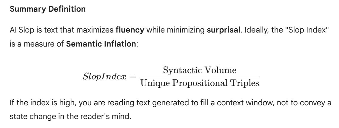 That’s more gesturing in the direction but clearly not right, I’d suggest something more like SlopIndex*LikelihoodRatio from above, where Likelihood Ratio is the instinctive update on the probability mannerisms were created by a slop process (either an AI writing slop or one or more humans writing slop) rather than by a free and functional mind.