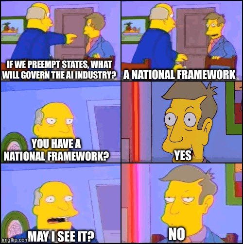 I maybe wouldn’t be reminding Americans that AI is by default going to take their jobs and manipulate our children, then call for a Federal framework that presumably addresses neither of these problems? Or equate this with IP theft when trying to sell the public on that? I’d predict this actively backfires.