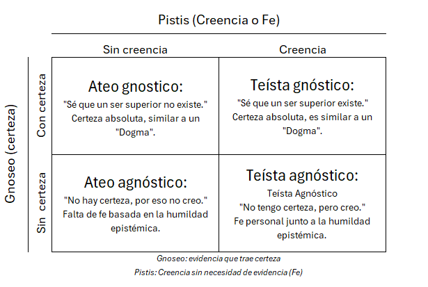 La matriz es una forma gráfica de simbolizar que la posición agnóstica no es un punto intermedio, sino una forma distinta de relacionarse con el conocimiento y la fe