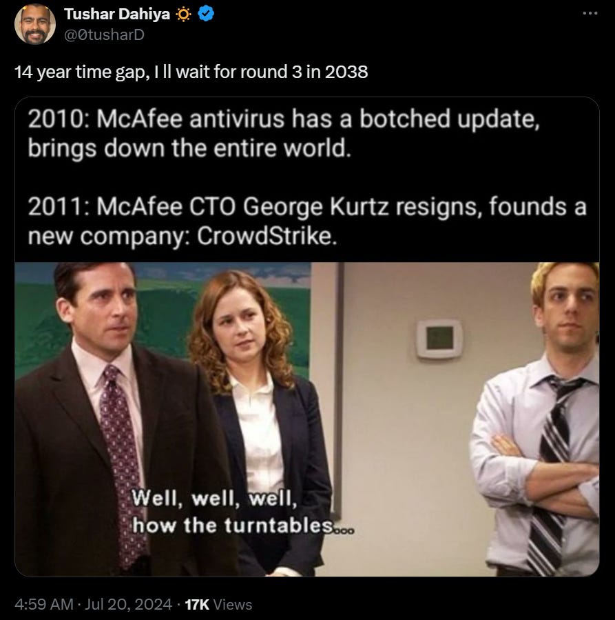 Addendum: Crowdstrike also has MacOS and Linux products, and those are a useful comparison in the matter of whether we should be blaming Microsoft.