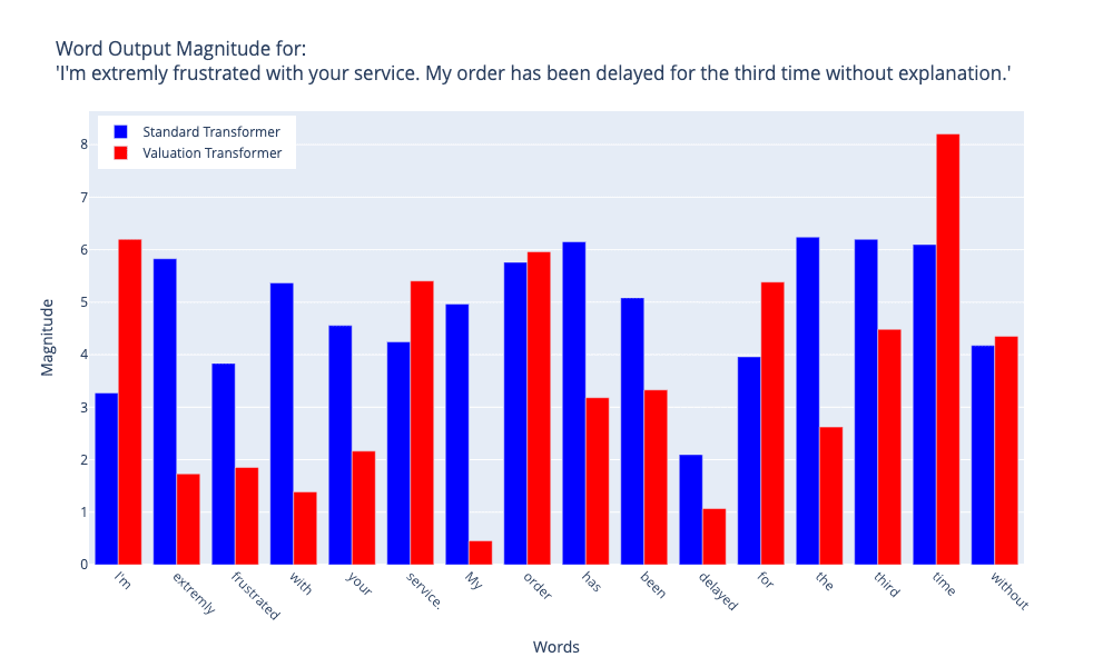 Figures 2 and 3 illustrate the magnitudes of word output for two sentences that were processed by both the Standard Transformer and the Valuation Transformer models. Figure 2 illustrates the analysis of a customer complaint stating, "I'm extremly frustrated with your service. My order has been delayed for the third time without explanation.". Figure 3 shows the analysis of a statement that has subtle irony: "The brilliantly terrible movie had the audience laughing hysterically, though not for the reasons the director intended".