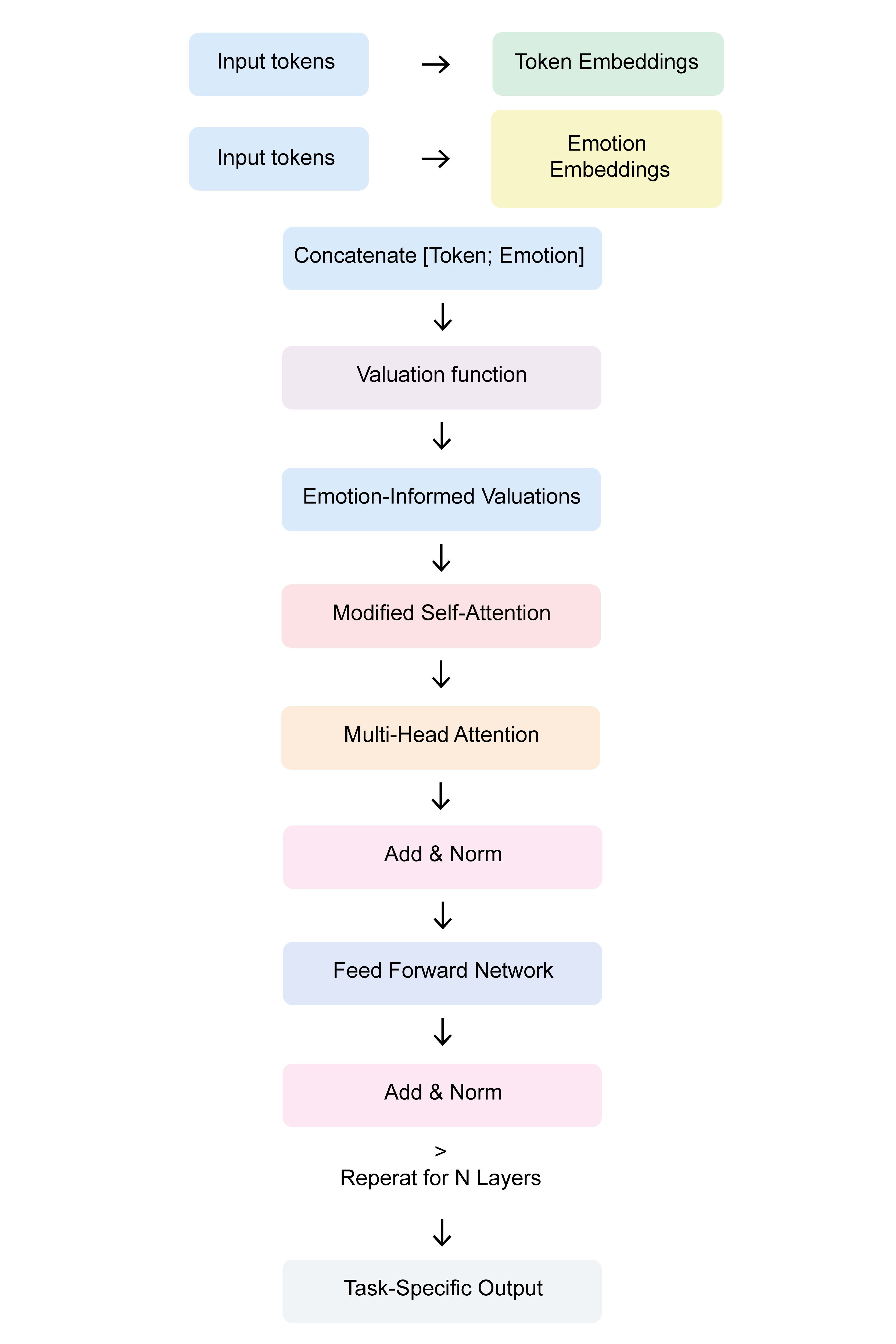 Figure 1: Flow from token and emotion embeddings to the final output in our proposed emotion-informed transformer model. Image by author
